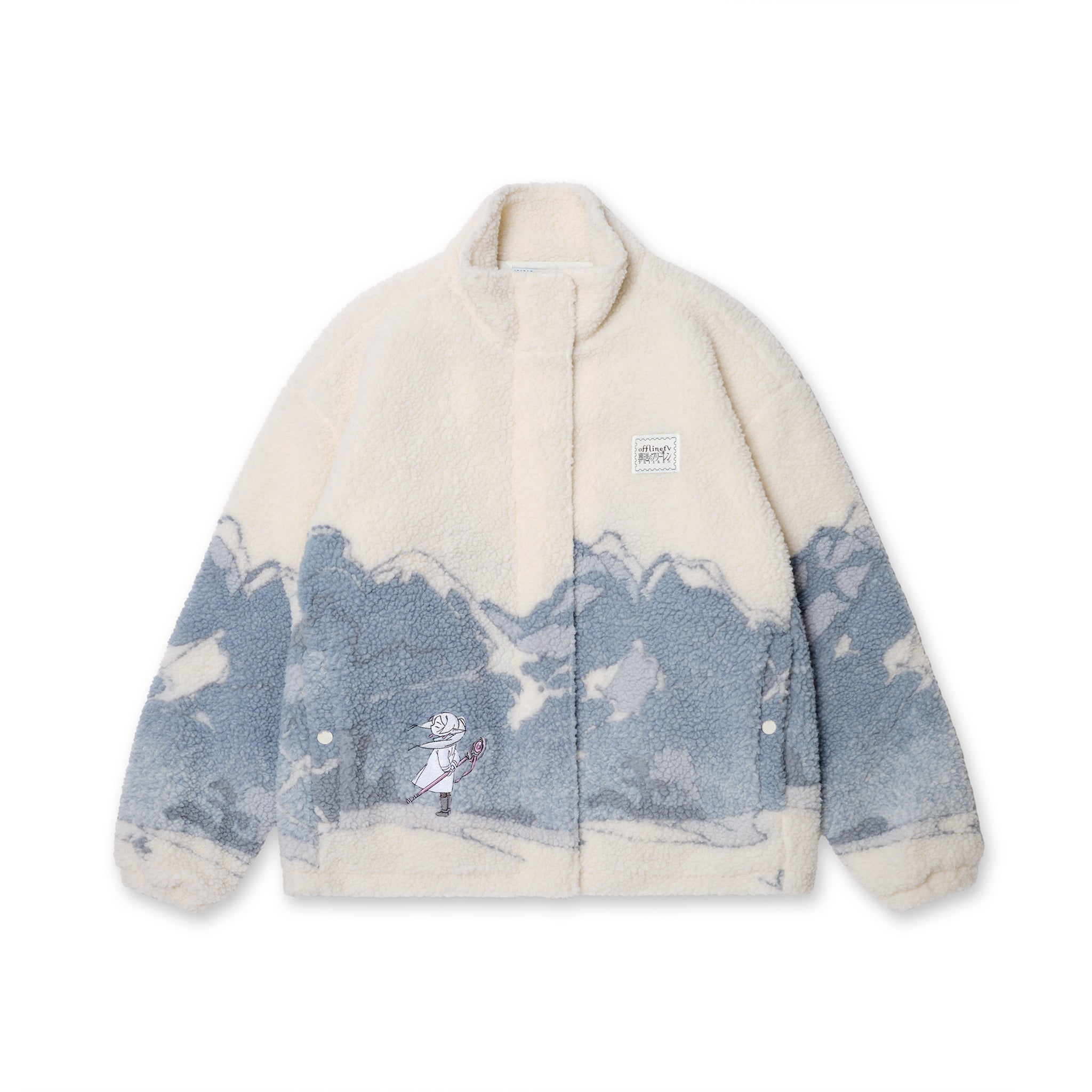 The jacket features a heavyweight sherpa fleece exterior for warmth, paired with a quilted nylon interior for structure and luxurious comfort. A YKK zipper is concealed beneath a clean front flap to preserve the artwork’s flow, while custom OfflineTV logo snaps and an embroidered Frieren detail at the front pocket add character-driven finishes without disrupting the overall design.